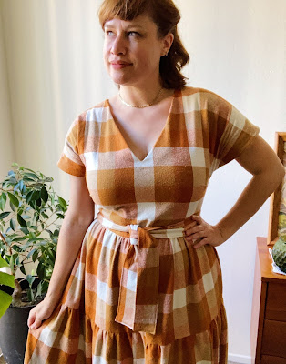 Materials: A Pumpkin Spice plaid from Ye Olde Joann’s, a brushed cotton yarn-dyed fabric. This fabric CALLED to me from the shelf. I was innocently shopping for Halloween Costume Supplies™ and it flew into my cart and demanded to be made into a maxi dress. After moving a few months ago, I am very aware that I do not need any more fabric, yarn or craft supplies, but this one GOT ME.